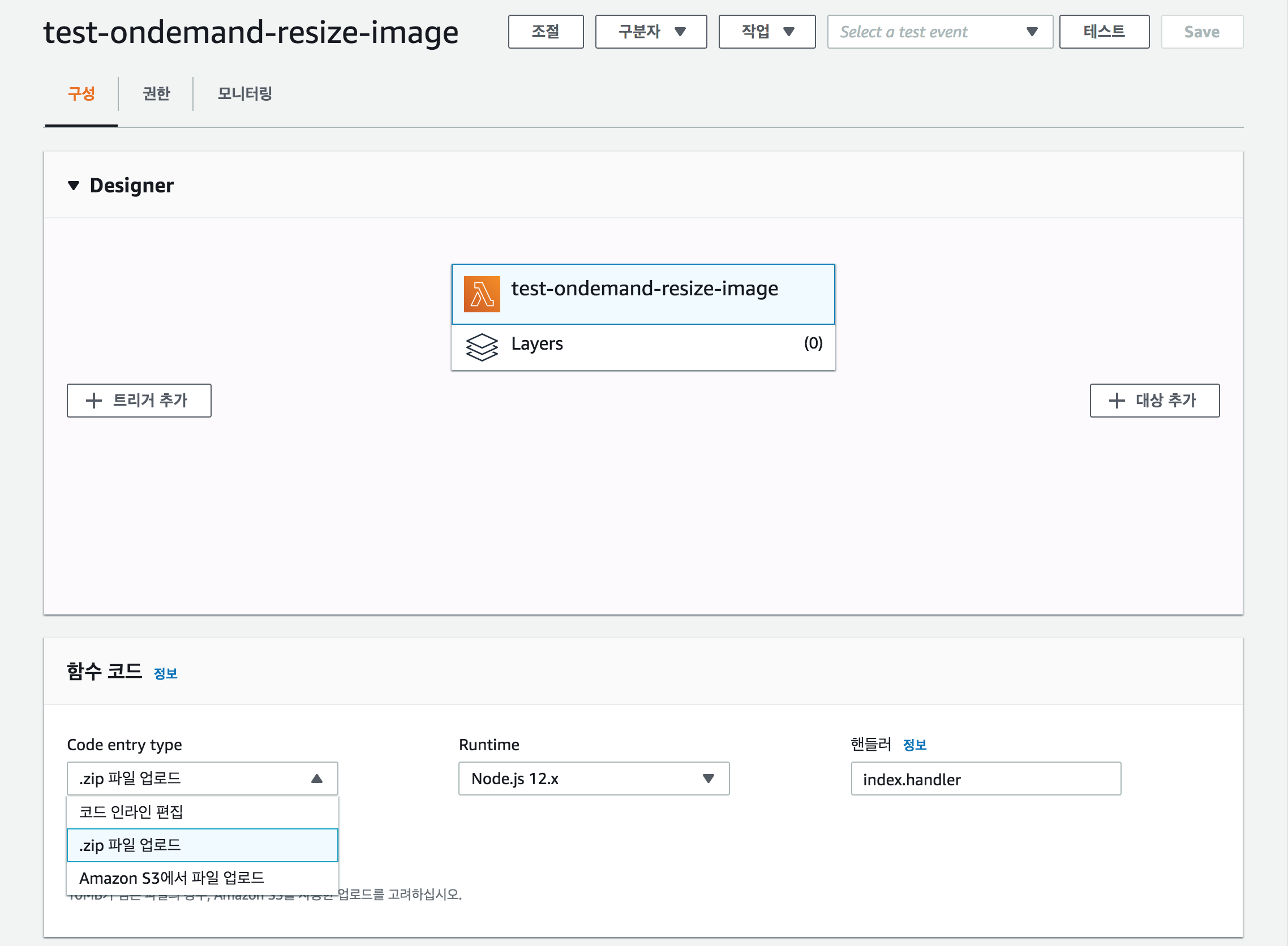 'Code entry type' 에서 .zip 파일 업로드를 클릭 후 하단의 '함수 패키지'의 '업로드' 버튼을 클릭하여
