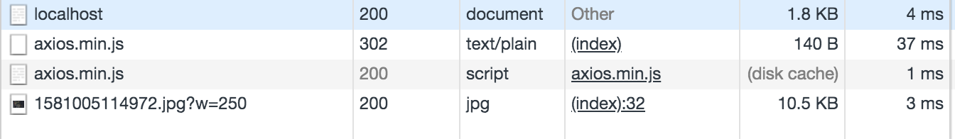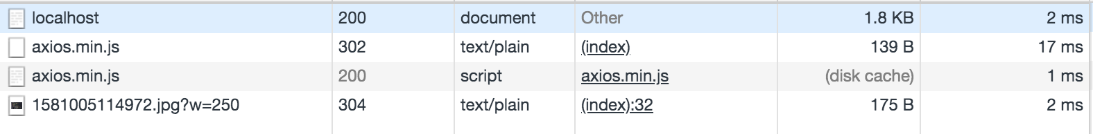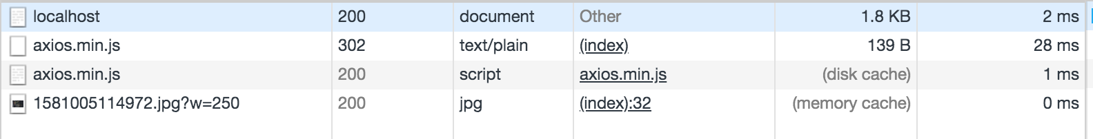'Memory cache'가 되고 status 200으로 나옵니다.