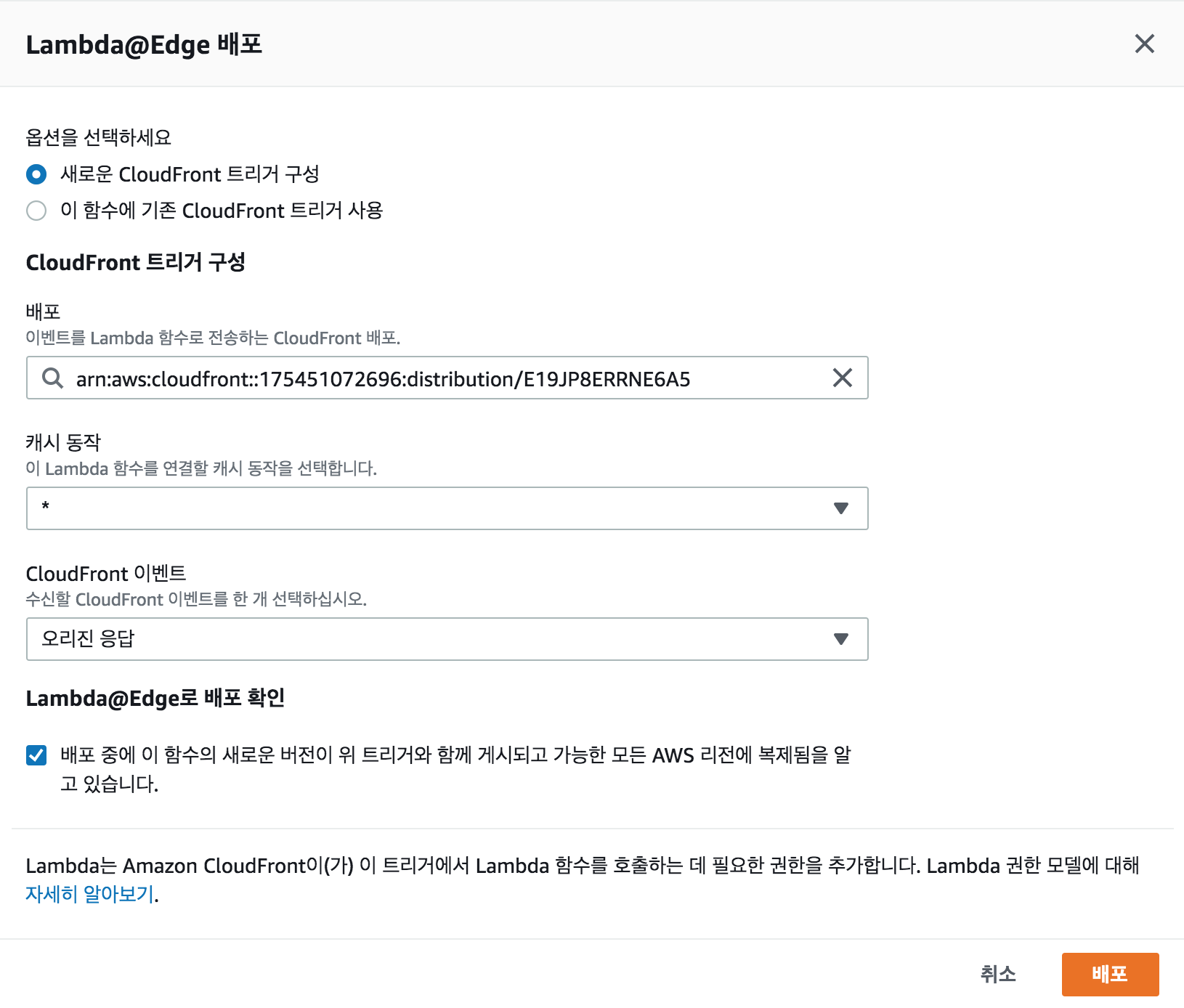 배포를 이전에 만든 CloudFront arn으로 변경 후 CloudFront 이벤트를 '오리진 응답'으로 선택하고, Lambda@Edge로 배포 확인을 체크합니다.