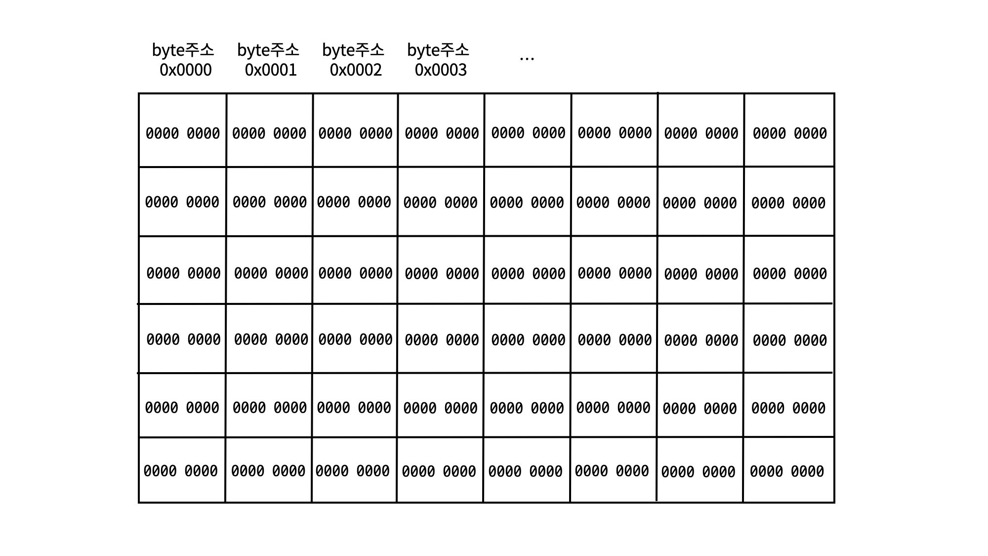 메모리 공간의 한 칸을 1 byte라고 했을 때 8 bit로 표현된다는 것을 대략적으로 확인할 수 있으며 해당 주소를 이용하여 메모리에 접근할 수 있습니다.