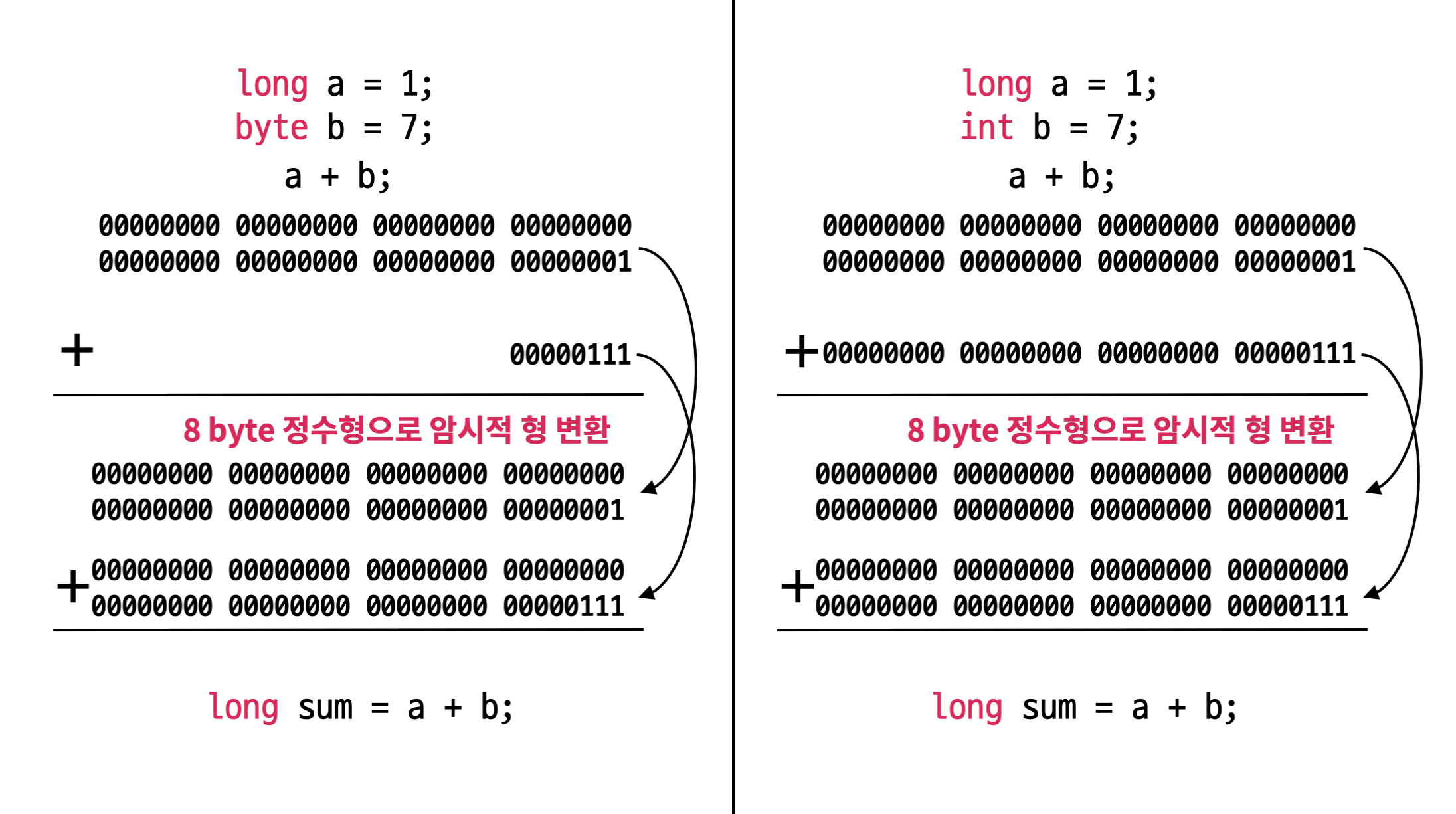 정수의 암시적 형 변환은 byte 패딩을 붙이는 방식으로 형 변환을 합니다.