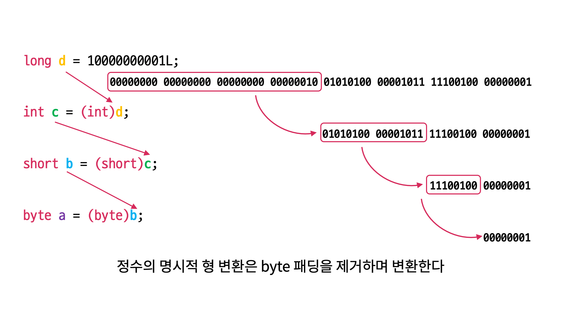 정수의 명시적 형 변환은 byte 패딩을 제거하는 방식으로 변환하기 때문에 데이터 손실이 발생합니다. 형 변환되는 자료형의 표현 범위를 벗어나는 데이터는 변조가 될 수 있습니다.