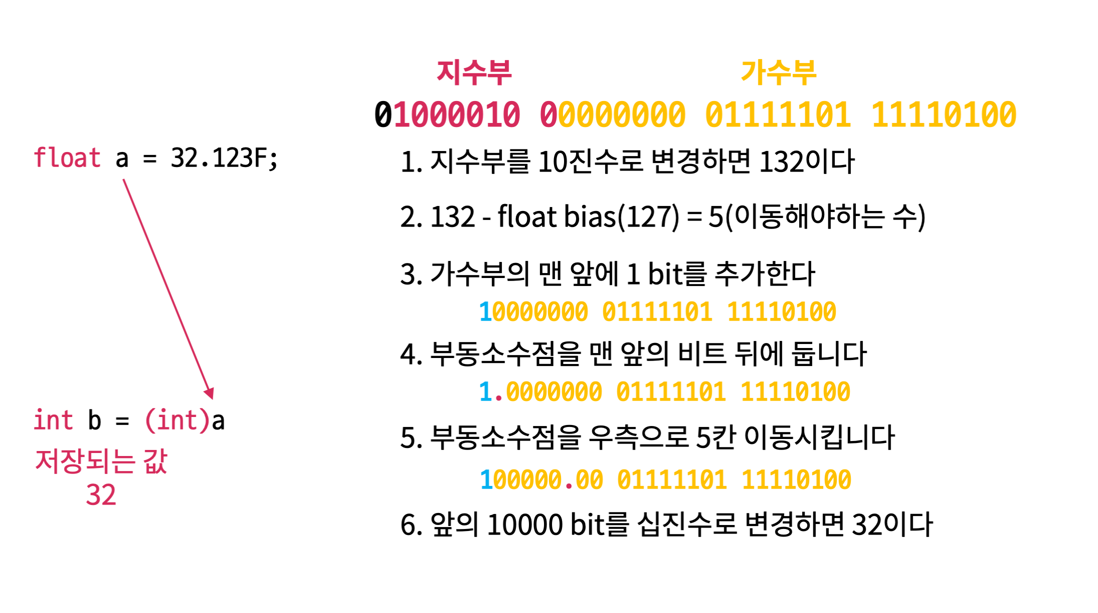 부동소수점은 소수점이 떠다닌다라는 의미를 가지고 있습니다. 이러한 부동소수점에서 정수를 추출하는 방법은 다음과 같습니다.