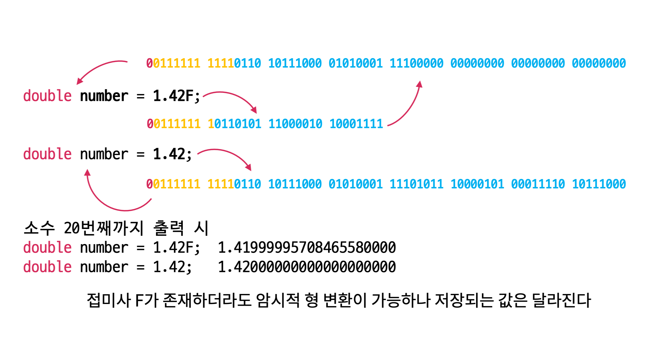 기본적으로 접미사 F가 작성되지 않은 리터럴은 배정도(8 byte)로 [스택 메모리에 일시적으로 저장]합니다. 그리고 double 형 변수에 저장됩니다. 그러나 접미사 F가 작성된 리터럴은 단정도(4 byte)로 스택 메모리에 일시적으로 저장되었다가 배정도(8 byte)로 변환한 후 double 형 변수에 저장됩니다.