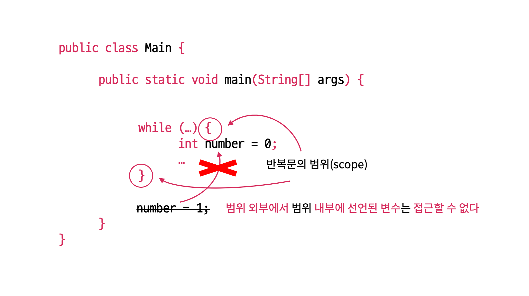 스코프(scope) 는 변수에 접근하기 위한 유효범위를 말하며 중괄호 내부를 하나의 범위로 볼 수 있습니다. 스코프의 특성은 범위 내에서는 범위 외부에 선언된 변수에 접근할 수 있으나 범위 외부에서는 범위 내부에 선언된 변수에 접근할 수 없습니다. 어려운 개념이 아닙니다.
