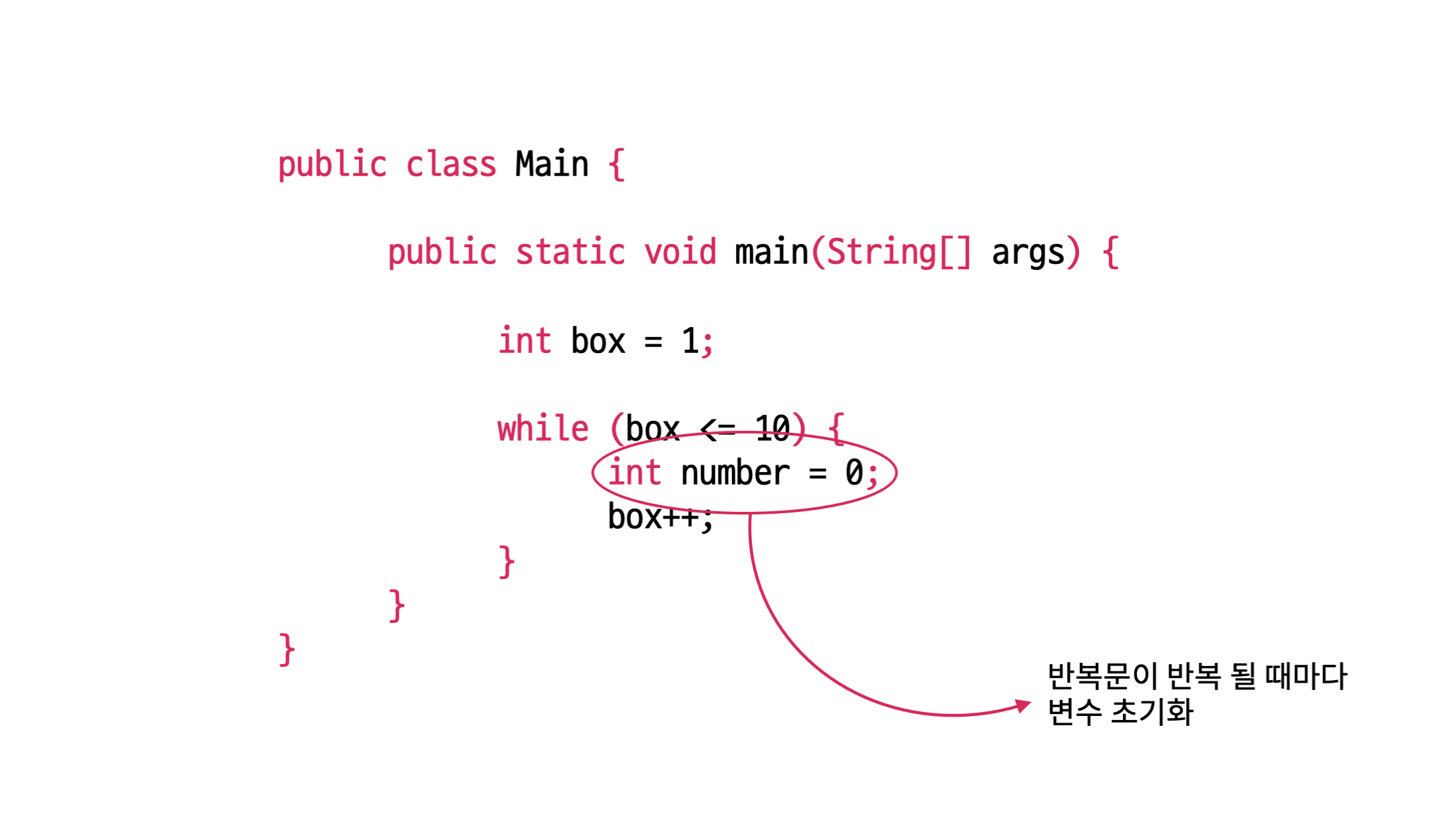 반복문 내부에 있는 변수는 반복문이 실행될 때마다 초기화를 반복합니다.